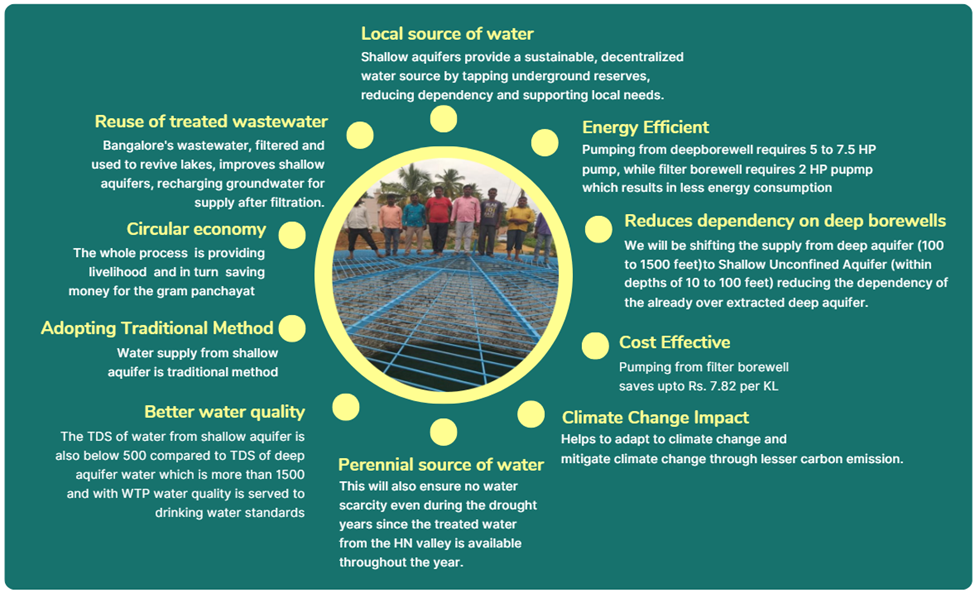 Biome Environmental Trust has been working to reverse this trend by integrating shallow aquifers into urban water management. This proposal builds on Biome Environmental Trustโs Integrated Urban Water Management approach in Devanahalli, Karnataka, where treated wastewater from Bengaluru and rainwater recharge a shallow aquifer (via a lake) meets 12% of water needs for 40,000 people (as of Dec 2024). Revived open wells and shallow filter borewells supply water treated to BIS-10500 standards, demonstrating local reuse’s viability and community and local government acceptance.ย This is Indiaโs first initiative incorporating shallow aquifers into formal water supply systems using Soil Aquifer Treatment (SAT), a model that could be expanded to meet full water demand while reducing reliance on deep borewells and high-energy extraction.